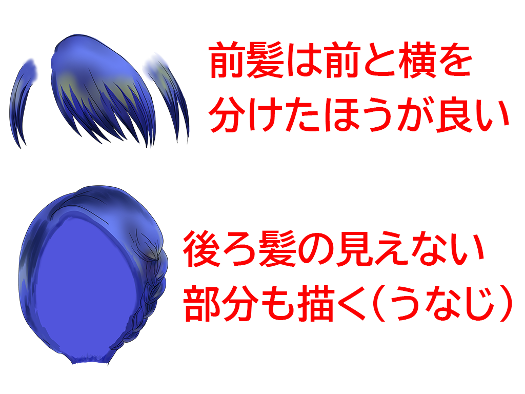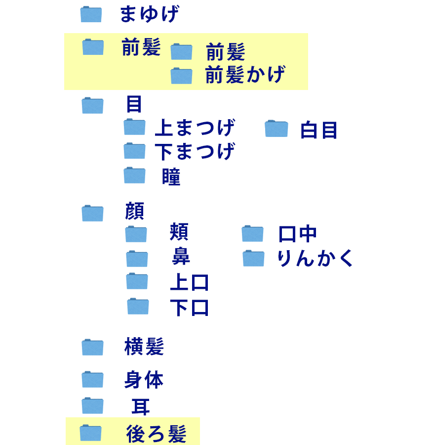 【流れ】前髪→よこがみ→まゆげ→顔の中のパーツ→りんかく→身体→首