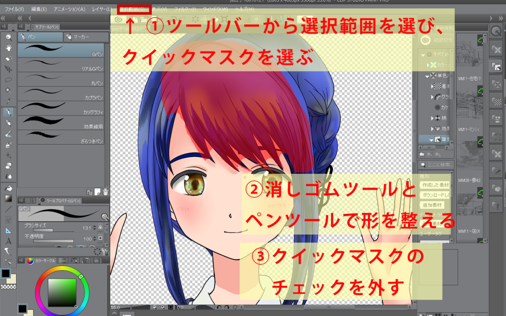 ④【投げ縄ツール】を使って、必要なパーツをかこむ(クイックマスク機能を使ってパーツ選択)