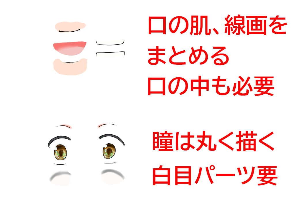 ・口のパーツは上唇線、下唇線、上唇肌、下唇肌、上下の歯、口中と細かくパーツわけ